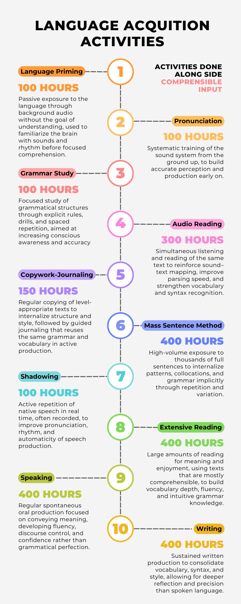 Language Priming → Pronunciation (and Orthography) → Grammar Study → Audio-Reading → Copywork / Journaling → Mass Sentence Method → Shadowing → Ouput + Extensive Reading